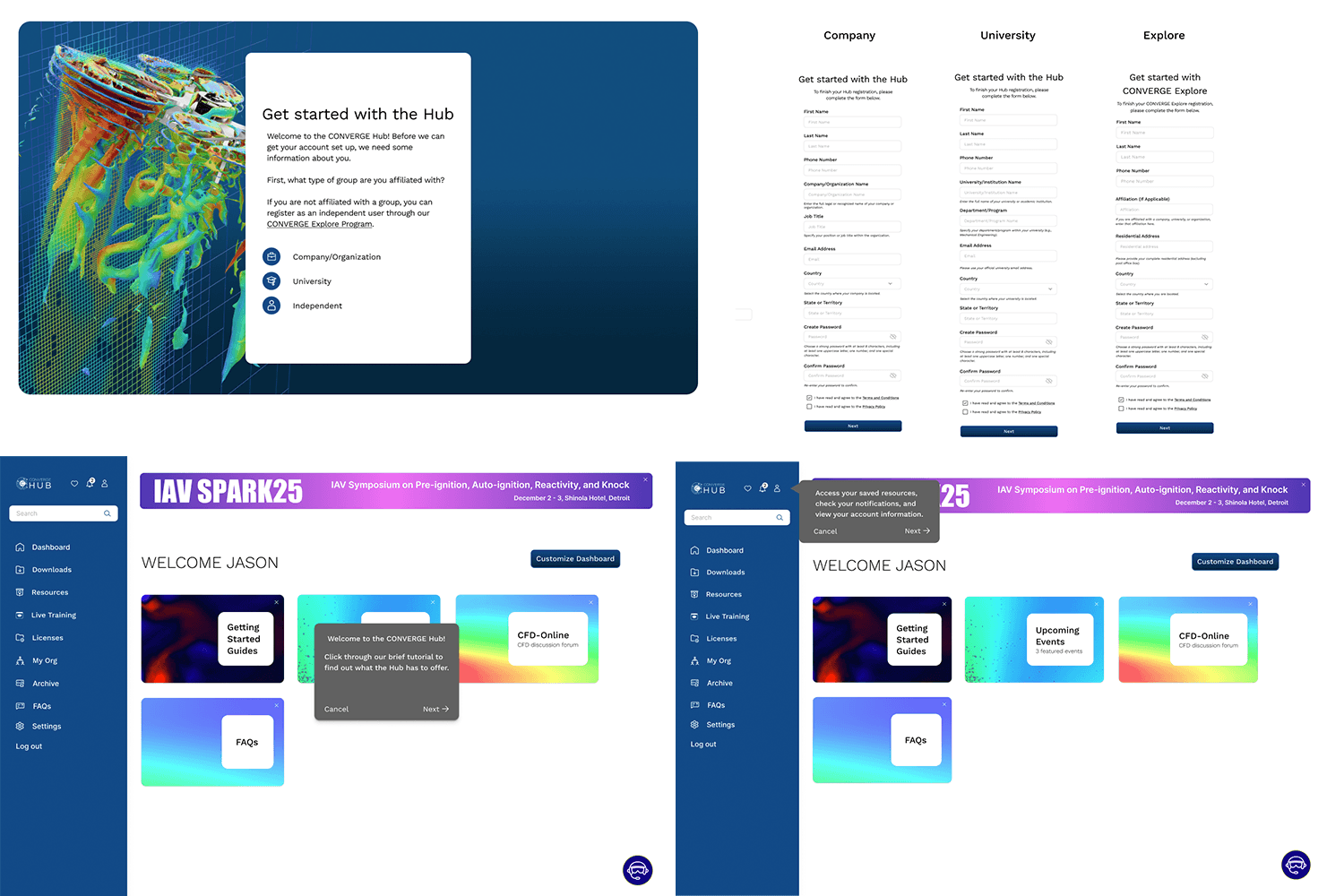 There are multiple hub user types for Convergent science. We narrowed down the registration flow for three types: Company, University and Independent. Each selection will take the user to fill out a specific form in order to associate their account with their user type. Once approved, there will be a welcome walk through popup guiding the user around the dashboard that they can choose to follow or close out.
